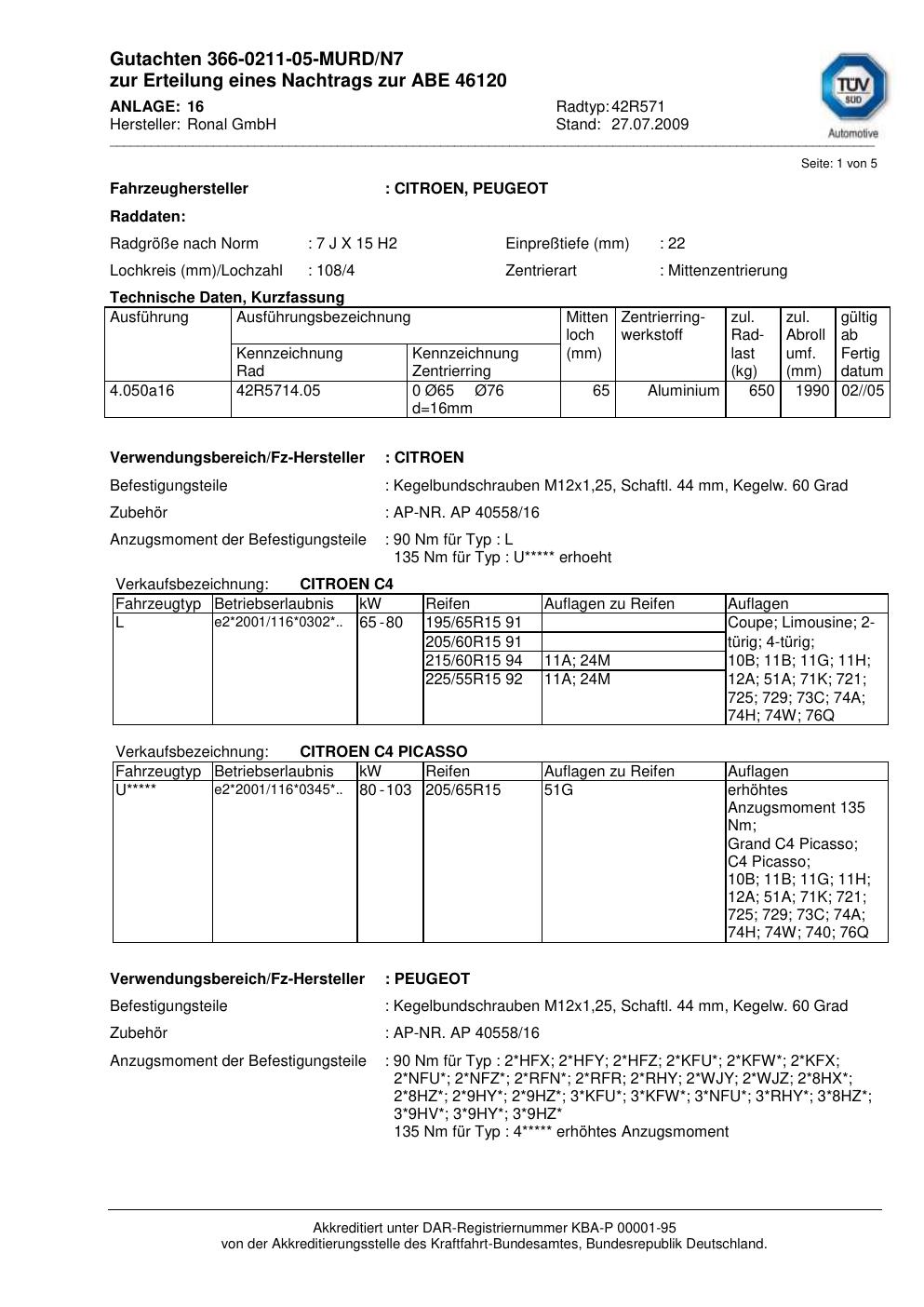 Dieses Gutachten (abe) bezieht sich auf die Alufelge Ronal 42R571 in der Ausführung 7Jx15 ET 0, Mittenloch 0 mm (KBA 46120). Im PDF findest du typischerweise zulässige Reifengrößen, Auflagen/Anbauhinweise und – je nach Dokument – Hinweise zur Eintragung.