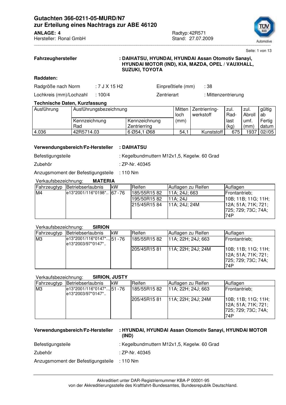 Dieses Gutachten (abe) bezieht sich auf die Alufelge Ronal 42R571 in der Ausführung 7Jx15 ET 0, Mittenloch 0 mm (KBA 46120). Im PDF findest du typischerweise zulässige Reifengrößen, Auflagen/Anbauhinweise und – je nach Dokument – Hinweise zur Eintragung.