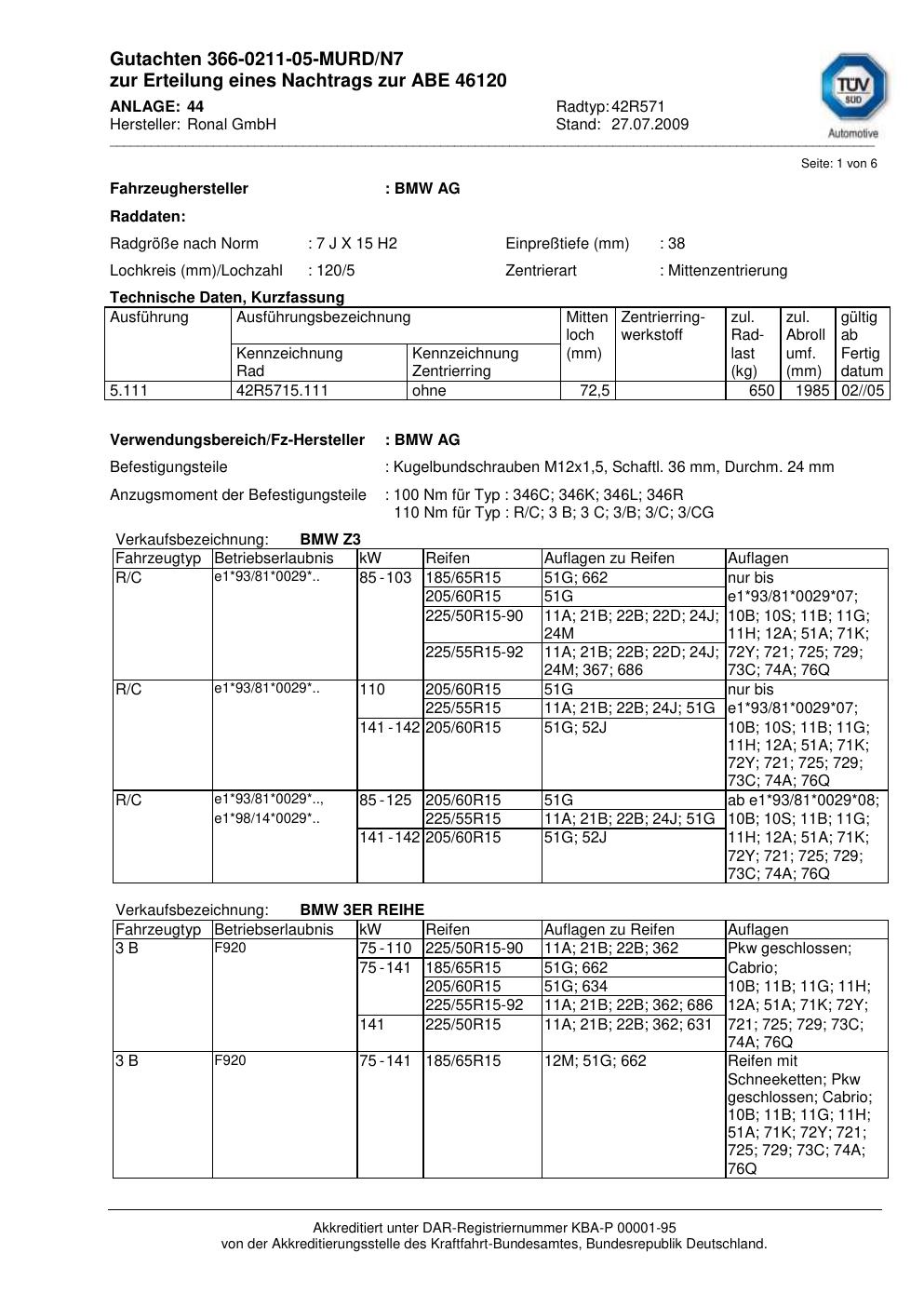 Dieses Gutachten (abe) bezieht sich auf die Alufelge Ronal 42R571 in der Ausführung 7Jx15 ET 0, Mittenloch 0 mm (KBA 46120). Im PDF findest du typischerweise zulässige Reifengrößen, Auflagen/Anbauhinweise und – je nach Dokument – Hinweise zur Eintragung.