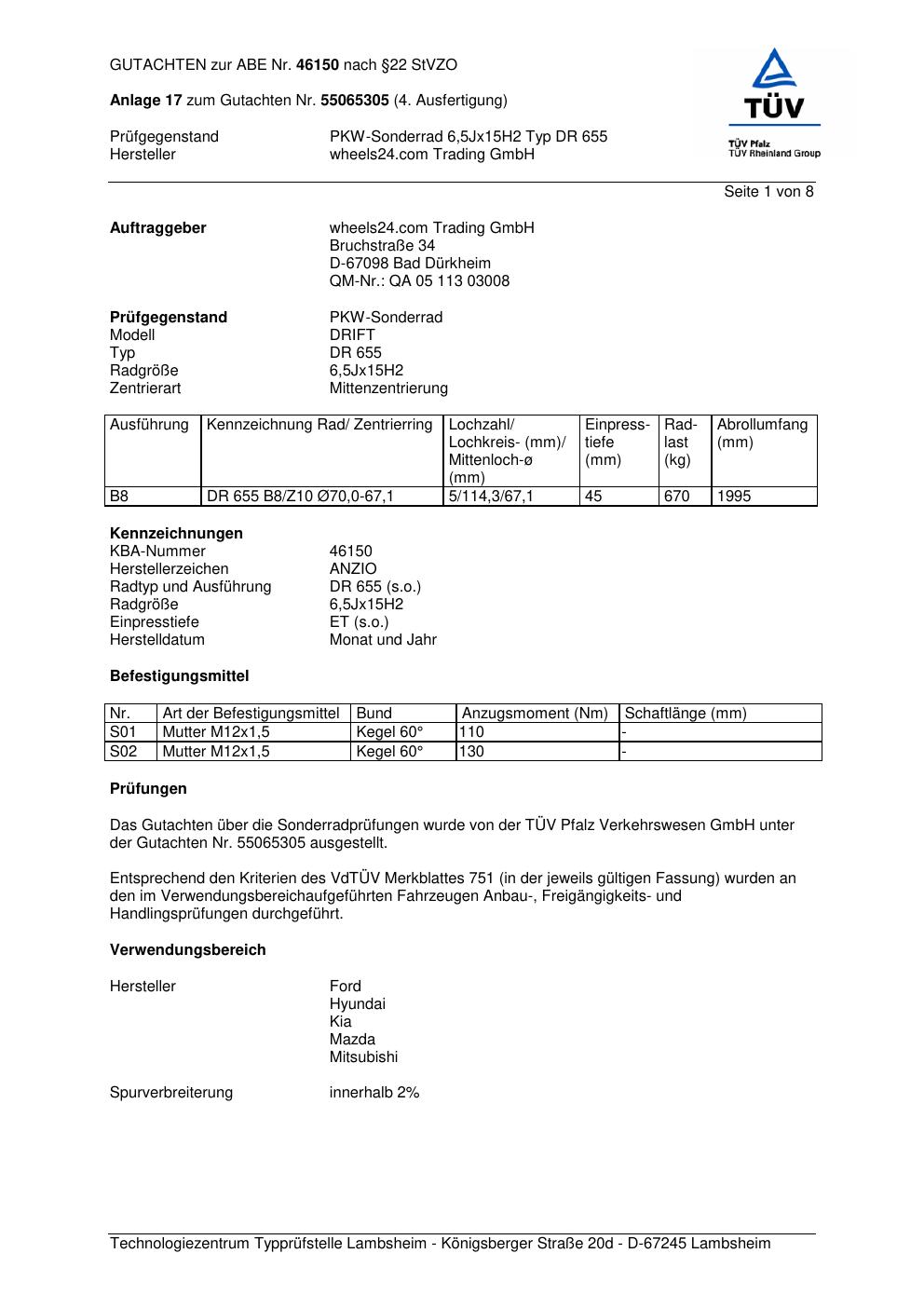 Felgengutachten / abe für Alufelgen Anzio DR 655 (6.5Jx15 ET 0, Mittenloch 0 mm) mit KBA 46150 (Zertifikatsnummer 46150). Hier kostenlos als PDF herunterladen. Der Download-Link ist 24 Stunden gültig und kann bis zu zwei Mal verwendet werden.