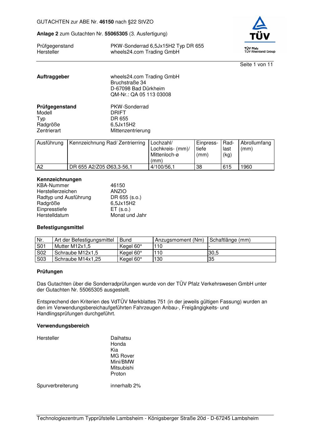 Felgengutachten / abe für Alufelgen Anzio DR 655 (6.5Jx15 ET 0, Mittenloch 0 mm) mit KBA 46150 (Zertifikatsnummer 46150). Hier kostenlos als PDF herunterladen. Der Download-Link ist 24 Stunden gültig und kann bis zu zwei Mal verwendet werden.
