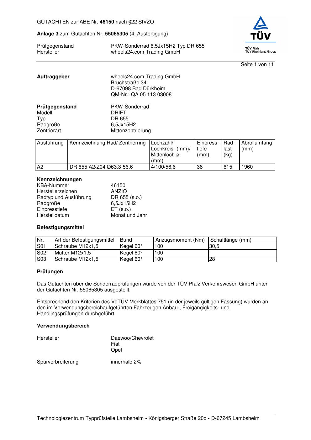 Dieses Gutachten (abe) bezieht sich auf die Alufelge Anzio DR 655 in der Ausführung 6.5Jx15 ET 0, Mittenloch 0 mm (KBA 46150). Im PDF findest du typischerweise zulässige Reifengrößen, Auflagen/Anbauhinweise und – je nach Dokument – Hinweise zur Eintragung.