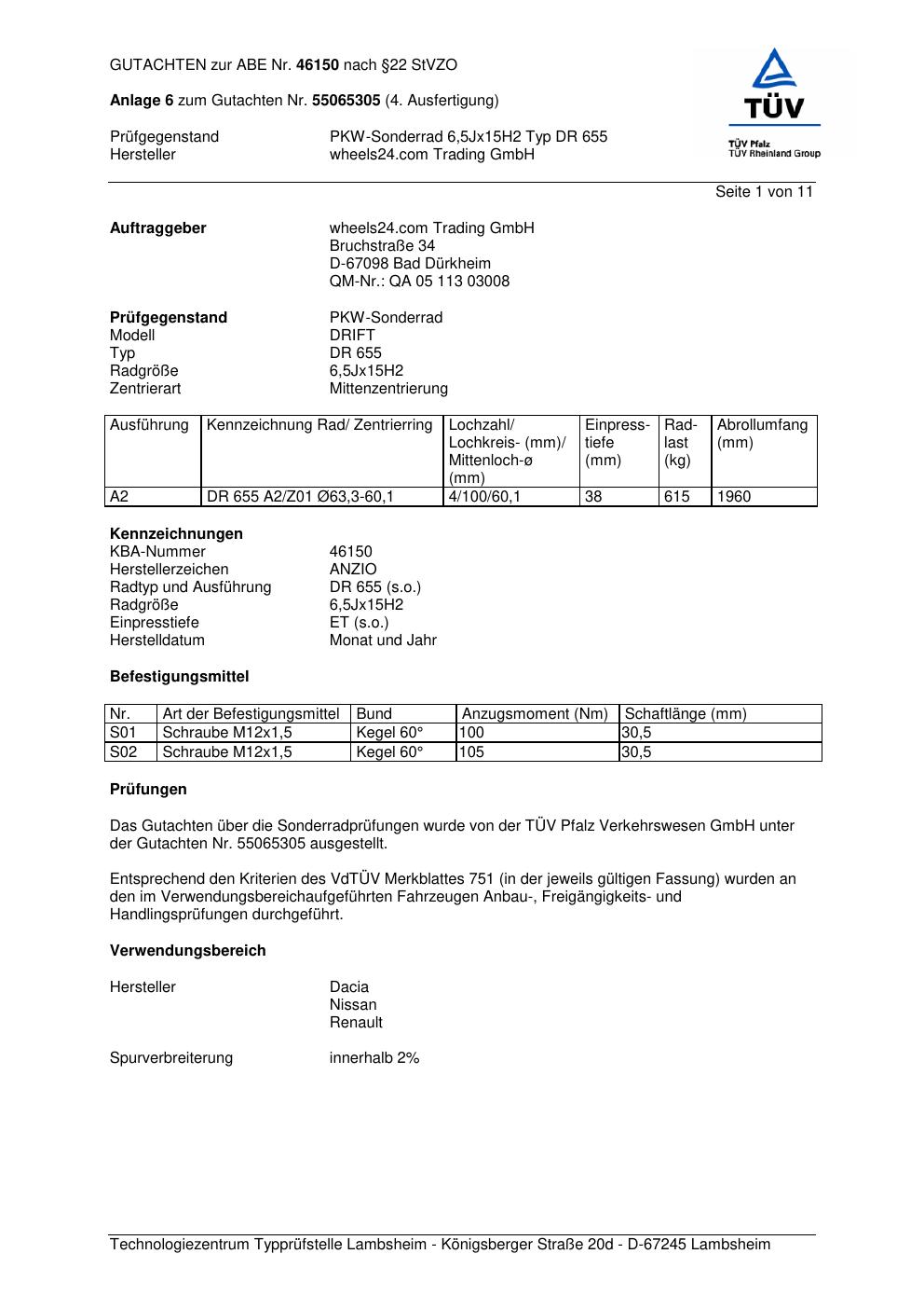 Dieses Gutachten (abe) bezieht sich auf die Alufelge Anzio DR 655 in der Ausführung 6.5Jx15 ET 0, Mittenloch 0 mm (KBA 46150). Im PDF findest du typischerweise zulässige Reifengrößen, Auflagen/Anbauhinweise und – je nach Dokument – Hinweise zur Eintragung.