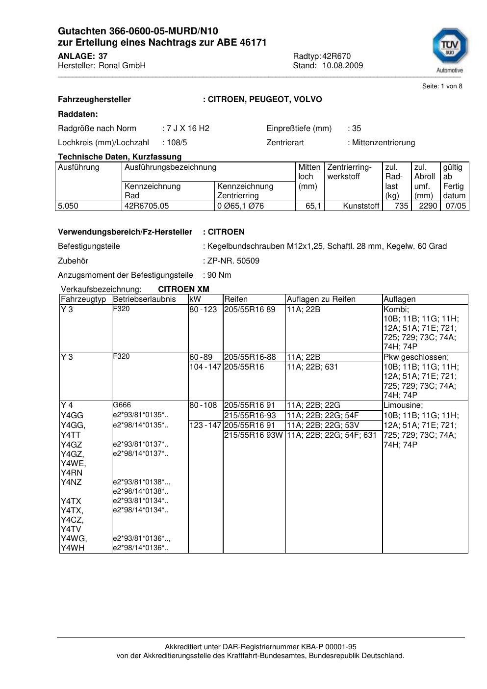 Dieses Gutachten (abe) bezieht sich auf die Alufelge Ronal 42R670 in der Ausführung 7Jx16 ET 0, Mittenloch 0 mm (KBA 46171). Im PDF findest du typischerweise zulässige Reifengrößen, Auflagen/Anbauhinweise und – je nach Dokument – Hinweise zur Eintragung.
