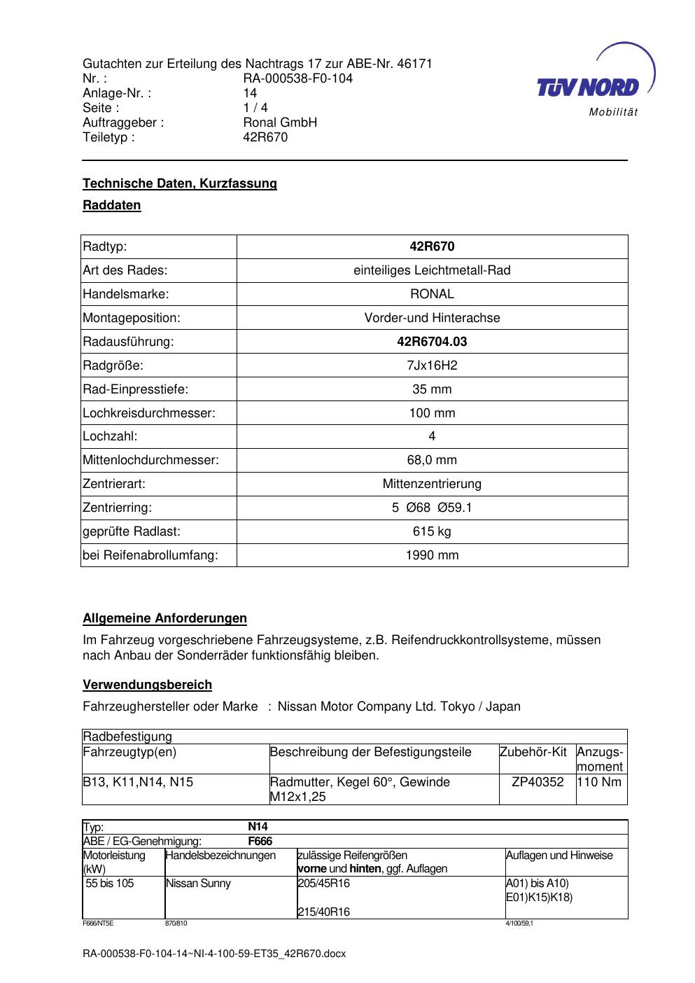 Dieses Gutachten (abe) bezieht sich auf die Alufelge Ronal 42R670 in der Ausführung 7Jx16 ET 0, Mittenloch 0 mm (KBA 46171). Im PDF findest du typischerweise zulässige Reifengrößen, Auflagen/Anbauhinweise und – je nach Dokument – Hinweise zur Eintragung.