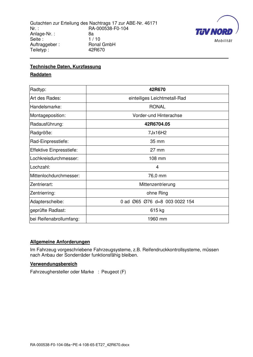 Dieses Gutachten (abe) bezieht sich auf die Alufelge Ronal 42R670 in der Ausführung 7Jx16 ET 0, Mittenloch 0 mm (KBA 46171). Im PDF findest du typischerweise zulässige Reifengrößen, Auflagen/Anbauhinweise und – je nach Dokument – Hinweise zur Eintragung.