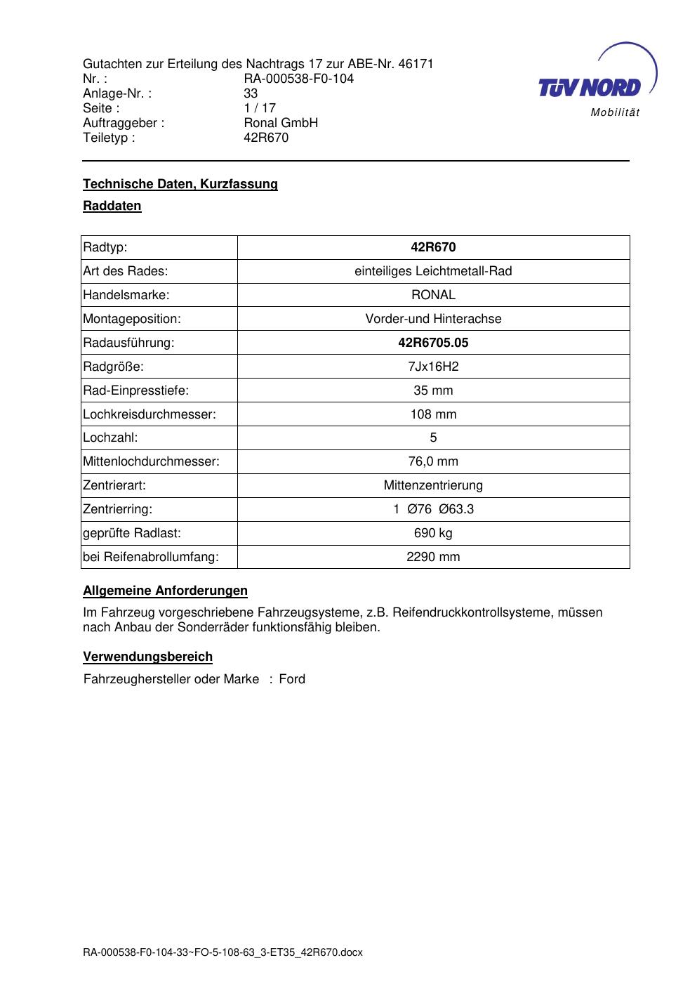 Dieses Gutachten (abe) bezieht sich auf die Alufelge Ronal 42R670 in der Ausführung 7Jx16 ET 0, Mittenloch 0 mm (KBA 46171). Im PDF findest du typischerweise zulässige Reifengrößen, Auflagen/Anbauhinweise und – je nach Dokument – Hinweise zur Eintragung.