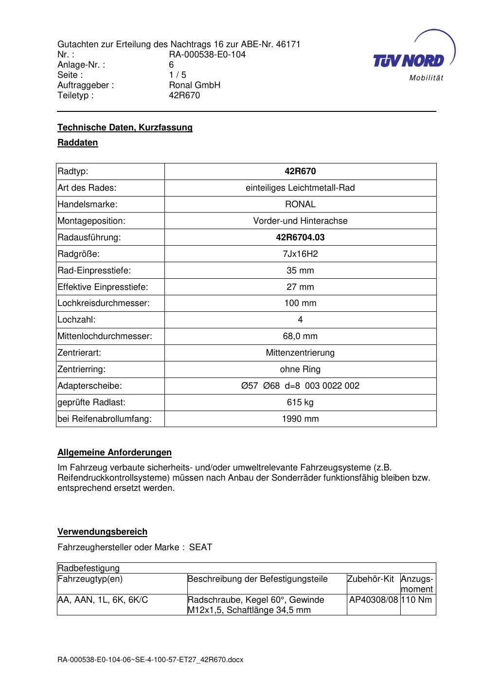 Dieses Gutachten (abe) bezieht sich auf die Alufelge Ronal 42R670 in der Ausführung 7Jx16 ET 0, Mittenloch 0 mm (KBA 46171). Im PDF findest du typischerweise zulässige Reifengrößen, Auflagen/Anbauhinweise und – je nach Dokument – Hinweise zur Eintragung.