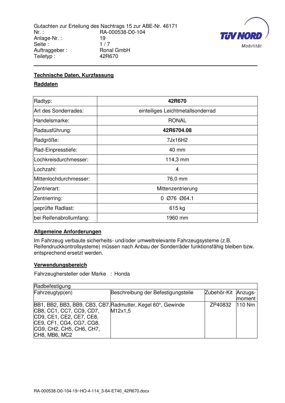 Dieses Gutachten (abe) bezieht sich auf die Alufelge Ronal 42R670 in der Ausführung 7Jx16 ET 0, Mittenloch 0 mm (KBA 46171). Im PDF findest du typischerweise zulässige Reifengrößen, Auflagen/Anbauhinweise und – je nach Dokument – Hinweise zur Eintragung.