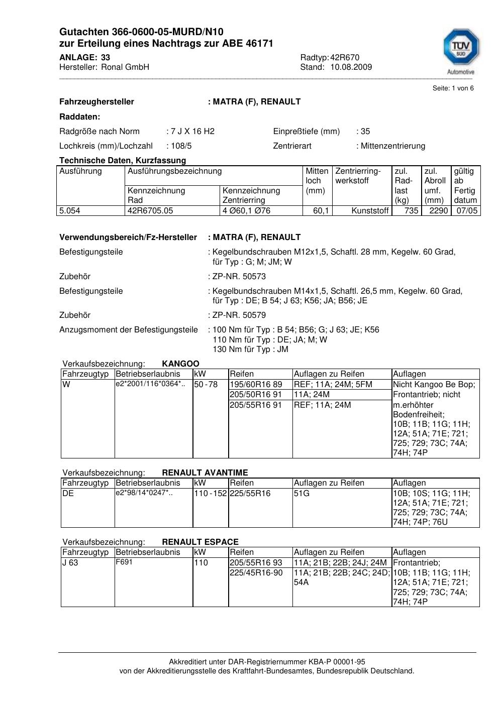 Dieses Gutachten (abe) bezieht sich auf die Alufelge Ronal 42R670 in der Ausführung 7Jx16 ET 0, Mittenloch 0 mm (KBA 46171). Im PDF findest du typischerweise zulässige Reifengrößen, Auflagen/Anbauhinweise und – je nach Dokument – Hinweise zur Eintragung.