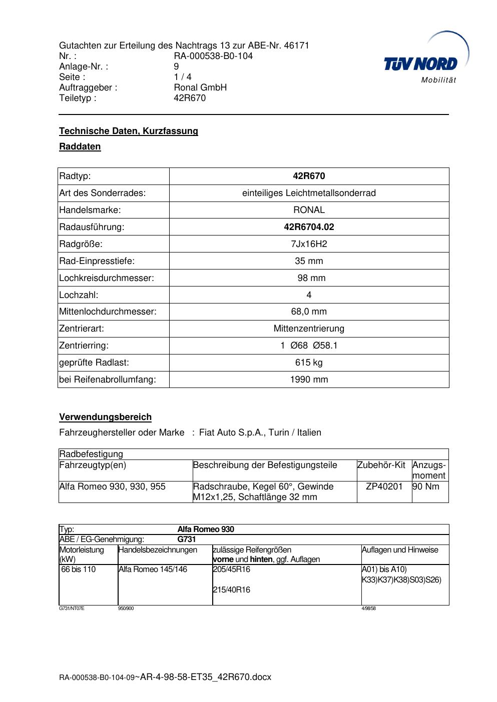 Dieses Gutachten (abe) bezieht sich auf die Alufelge Ronal 42R670 in der Ausführung 7Jx16 ET 0, Mittenloch 0 mm (KBA 46171). Im PDF findest du typischerweise zulässige Reifengrößen, Auflagen/Anbauhinweise und – je nach Dokument – Hinweise zur Eintragung.