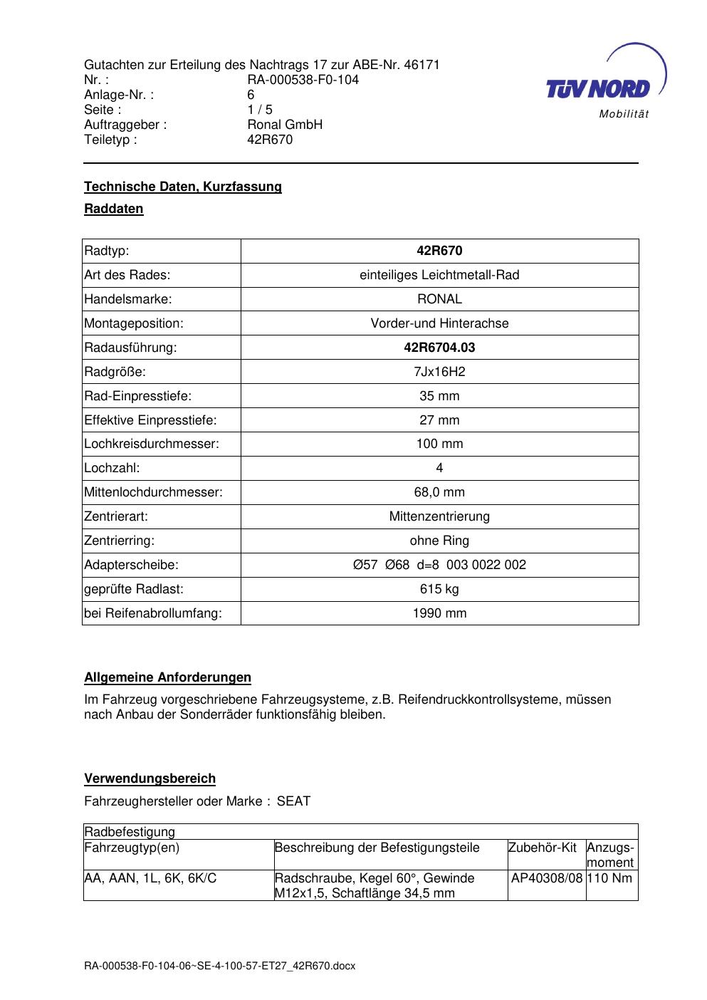 Dieses Gutachten (abe) bezieht sich auf die Alufelge Ronal 42R670 in der Ausführung 7Jx16 ET 0, Mittenloch 0 mm (KBA 46171). Im PDF findest du typischerweise zulässige Reifengrößen, Auflagen/Anbauhinweise und – je nach Dokument – Hinweise zur Eintragung.