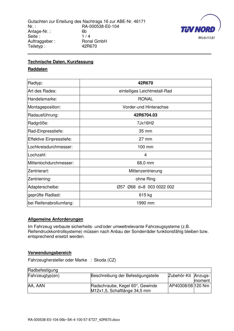 Dieses Gutachten (abe) bezieht sich auf die Alufelge Ronal 42R670 in der Ausführung 7Jx16 ET 0, Mittenloch 0 mm (KBA 46171). Im PDF findest du typischerweise zulässige Reifengrößen, Auflagen/Anbauhinweise und – je nach Dokument – Hinweise zur Eintragung.