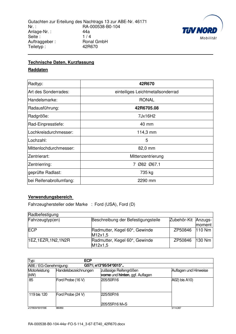 Dieses Gutachten (abe) bezieht sich auf die Alufelge Ronal 42R670 in der Ausführung 7Jx16 ET 0, Mittenloch 0 mm (KBA 46171). Im PDF findest du typischerweise zulässige Reifengrößen, Auflagen/Anbauhinweise und – je nach Dokument – Hinweise zur Eintragung.