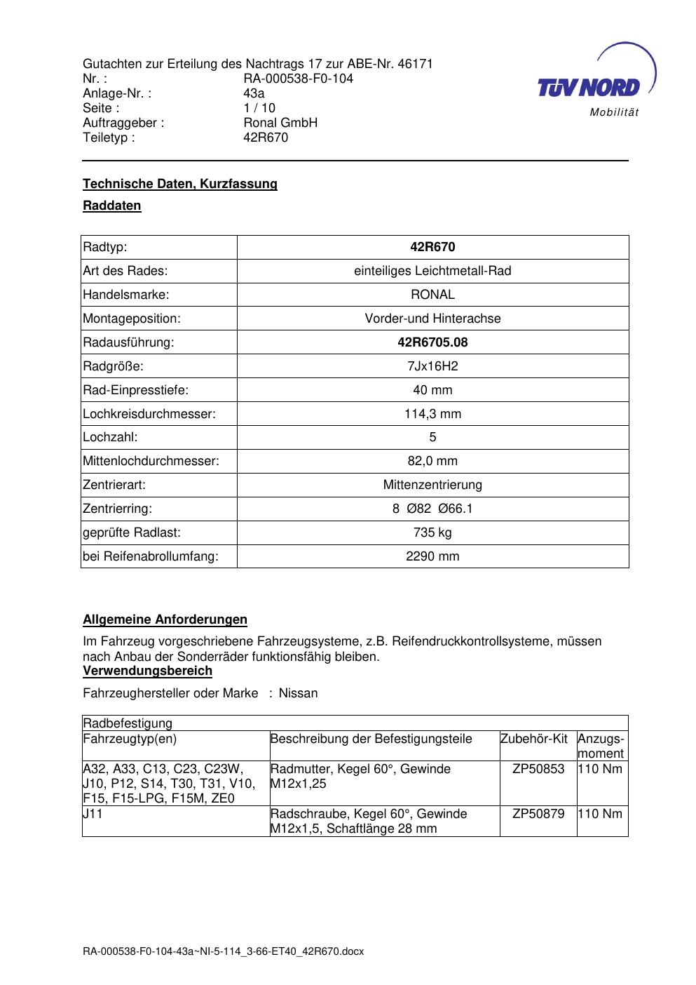 Dieses Gutachten (abe) bezieht sich auf die Alufelge Ronal 42R670 in der Ausführung 7Jx16 ET 0, Mittenloch 0 mm (KBA 46171). Im PDF findest du typischerweise zulässige Reifengrößen, Auflagen/Anbauhinweise und – je nach Dokument – Hinweise zur Eintragung.