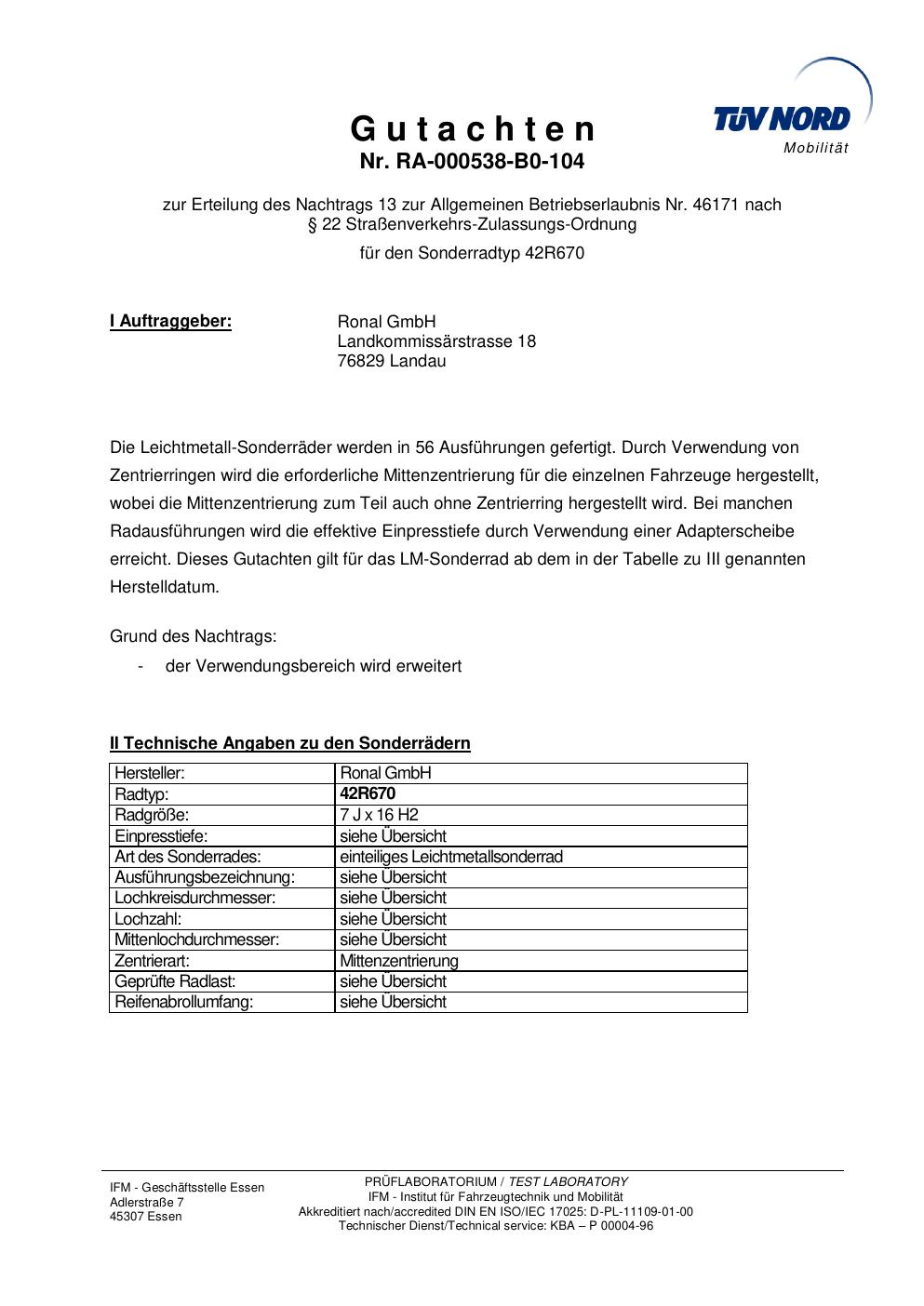 Dieses Gutachten (abe) bezieht sich auf die Alufelge Ronal 42R670 in der Ausführung 7Jx16 ET 0, Mittenloch 0 mm (KBA 46171). Im PDF findest du typischerweise zulässige Reifengrößen, Auflagen/Anbauhinweise und – je nach Dokument – Hinweise zur Eintragung.