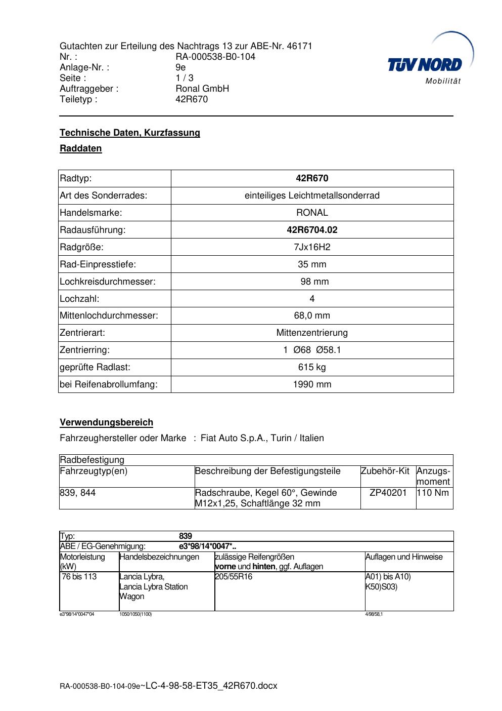 Dieses Gutachten (abe) bezieht sich auf die Alufelge Ronal 42R670 in der Ausführung 7Jx16 ET 0, Mittenloch 0 mm (KBA 46171). Im PDF findest du typischerweise zulässige Reifengrößen, Auflagen/Anbauhinweise und – je nach Dokument – Hinweise zur Eintragung.