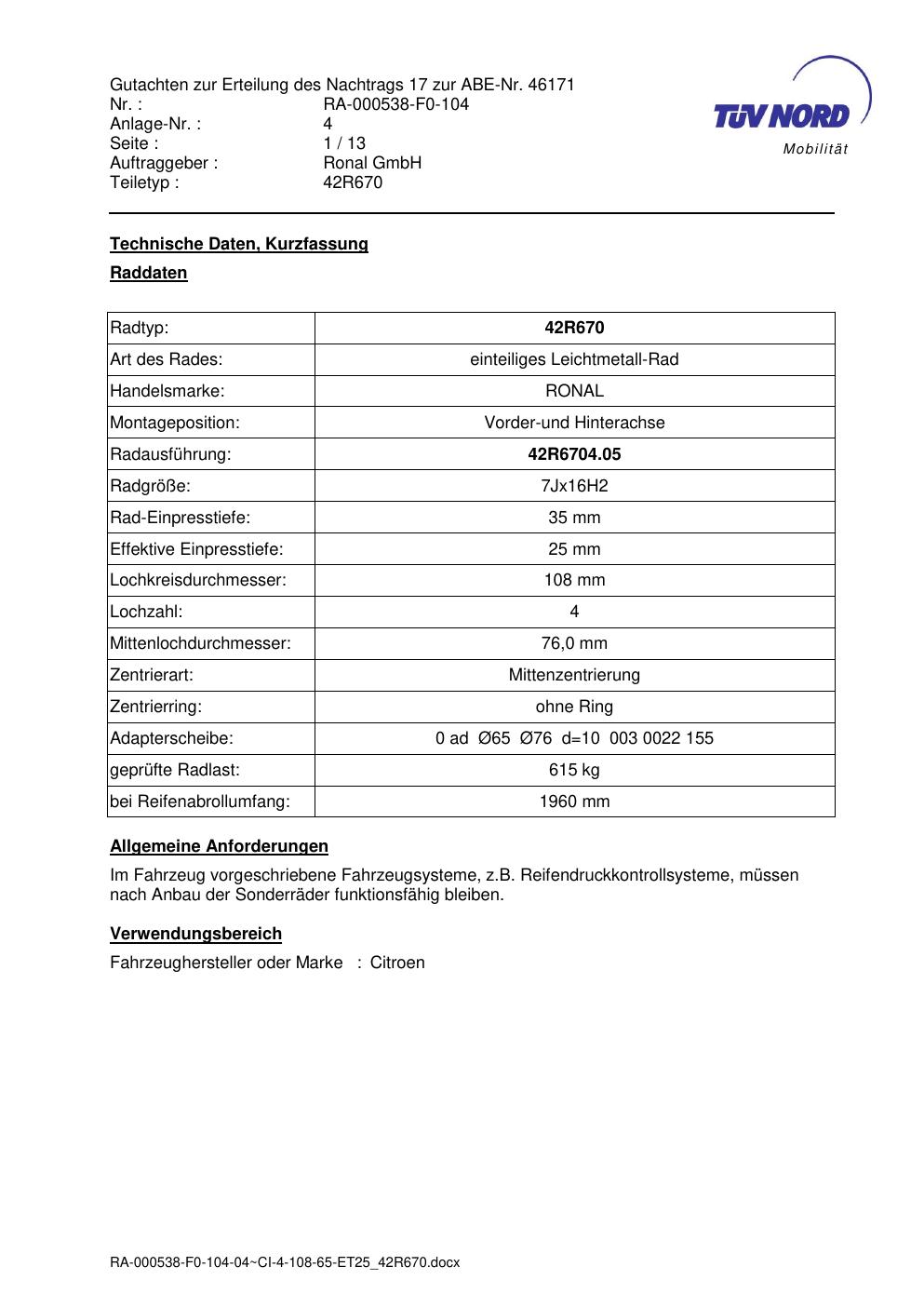 Dieses Gutachten (abe) bezieht sich auf die Alufelge Ronal 42R670 in der Ausführung 7Jx16 ET 0, Mittenloch 0 mm (KBA 46171). Im PDF findest du typischerweise zulässige Reifengrößen, Auflagen/Anbauhinweise und – je nach Dokument – Hinweise zur Eintragung.