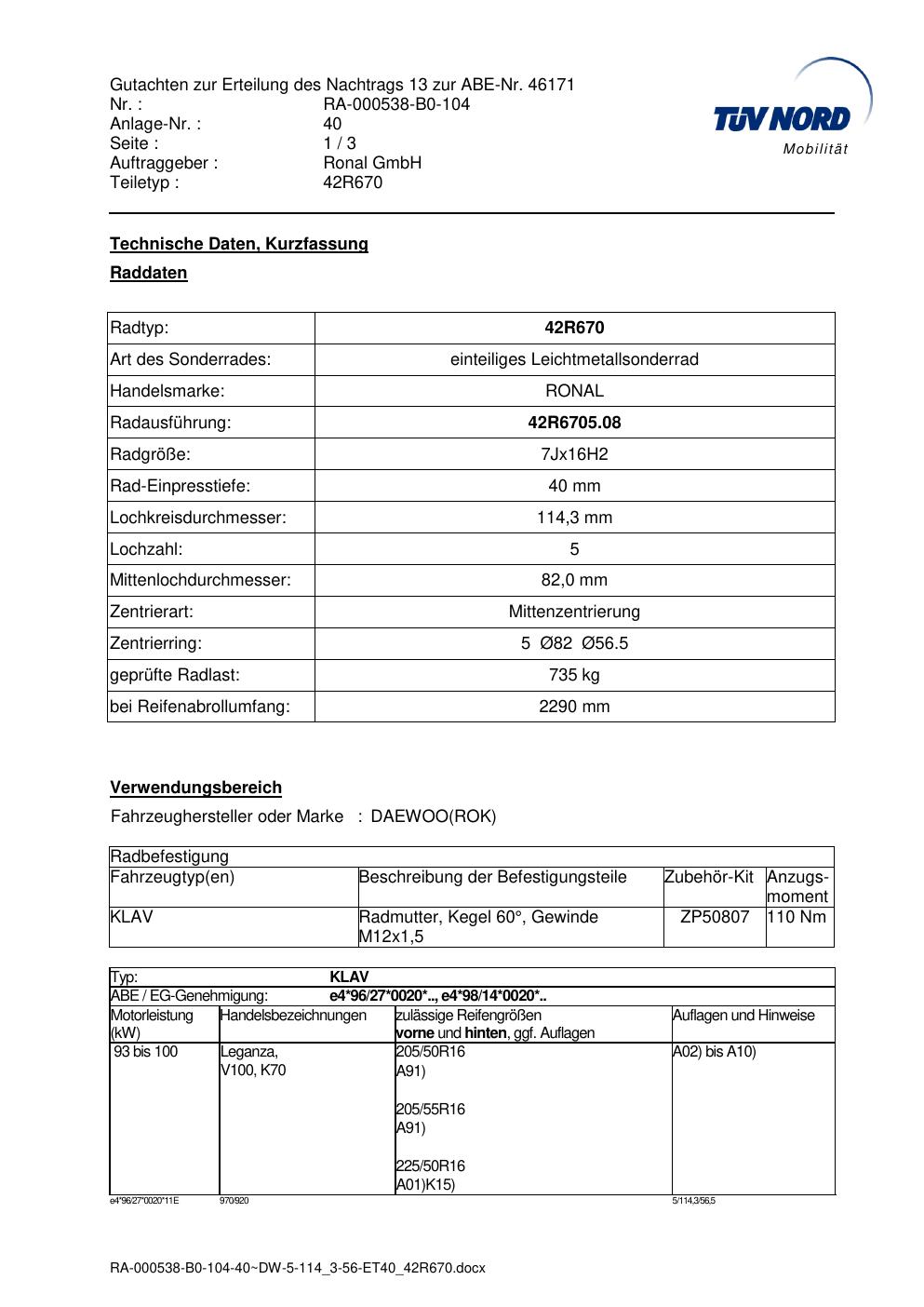 Dieses Gutachten (abe) bezieht sich auf die Alufelge Ronal 42R670 in der Ausführung 7Jx16 ET 0, Mittenloch 0 mm (KBA 46171). Im PDF findest du typischerweise zulässige Reifengrößen, Auflagen/Anbauhinweise und – je nach Dokument – Hinweise zur Eintragung.