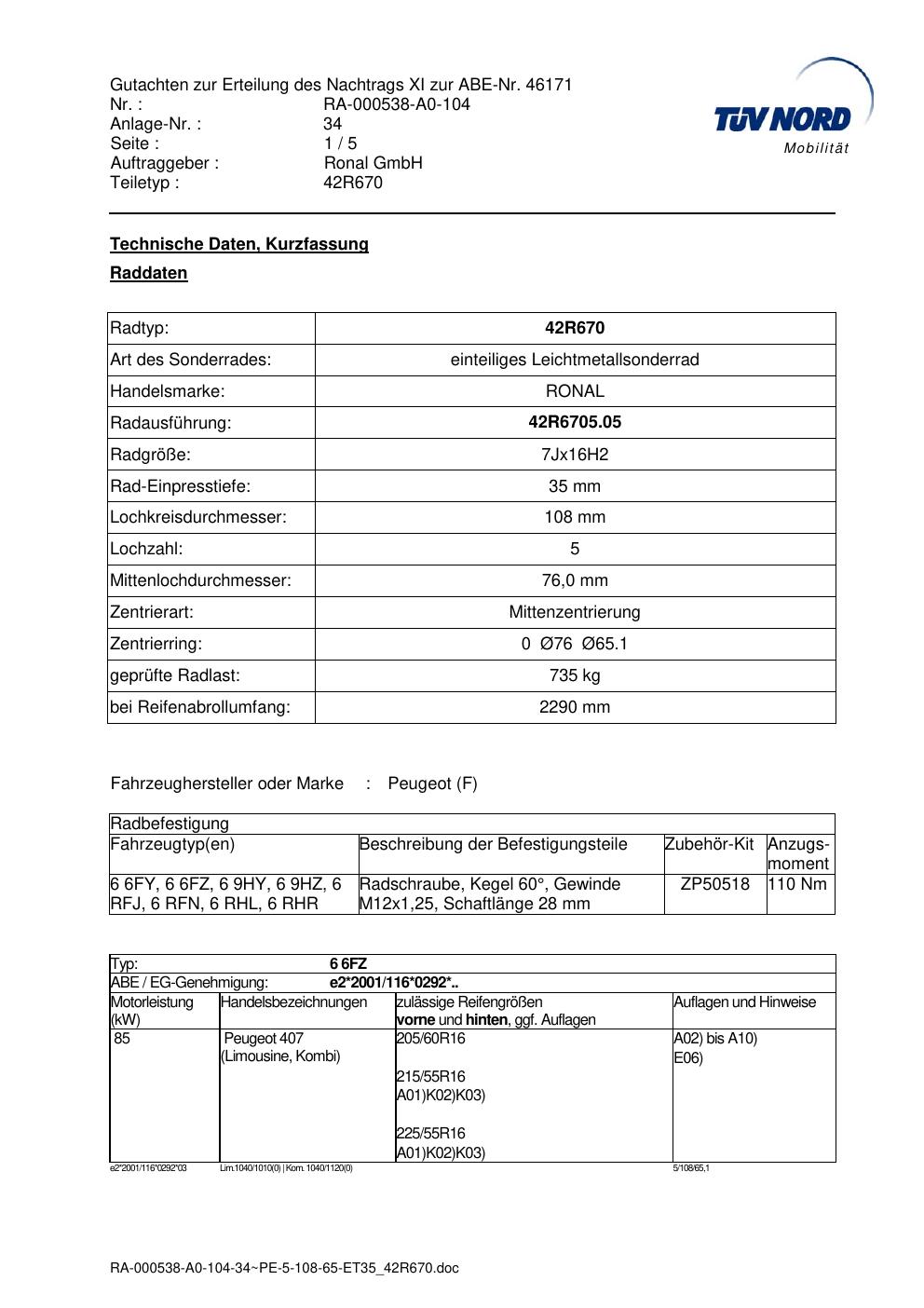 Dieses Gutachten (abe) bezieht sich auf die Alufelge Ronal 42R670 in der Ausführung 7Jx16 ET 0, Mittenloch 0 mm (KBA 46171). Im PDF findest du typischerweise zulässige Reifengrößen, Auflagen/Anbauhinweise und – je nach Dokument – Hinweise zur Eintragung.