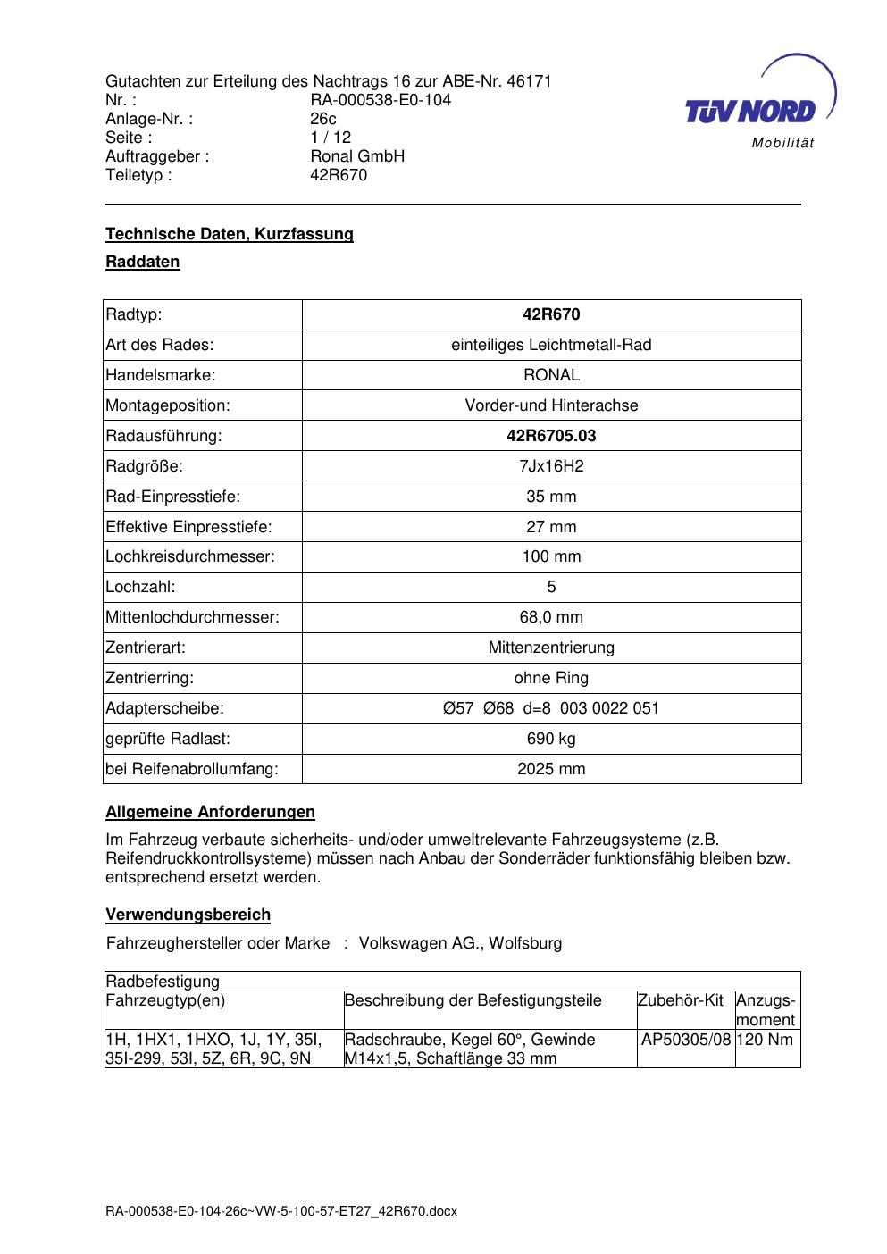 Dieses Gutachten (abe) bezieht sich auf die Alufelge Ronal 42R670 in der Ausführung 7Jx16 ET 0, Mittenloch 0 mm (KBA 46171). Im PDF findest du typischerweise zulässige Reifengrößen, Auflagen/Anbauhinweise und – je nach Dokument – Hinweise zur Eintragung.