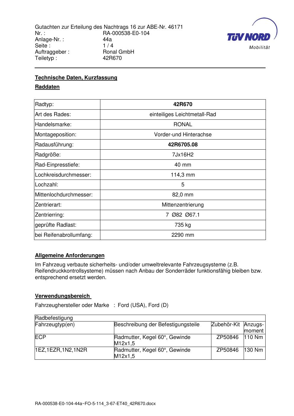 Dieses Gutachten (abe) bezieht sich auf die Alufelge Ronal 42R670 in der Ausführung 7Jx16 ET 0, Mittenloch 0 mm (KBA 46171). Im PDF findest du typischerweise zulässige Reifengrößen, Auflagen/Anbauhinweise und – je nach Dokument – Hinweise zur Eintragung.