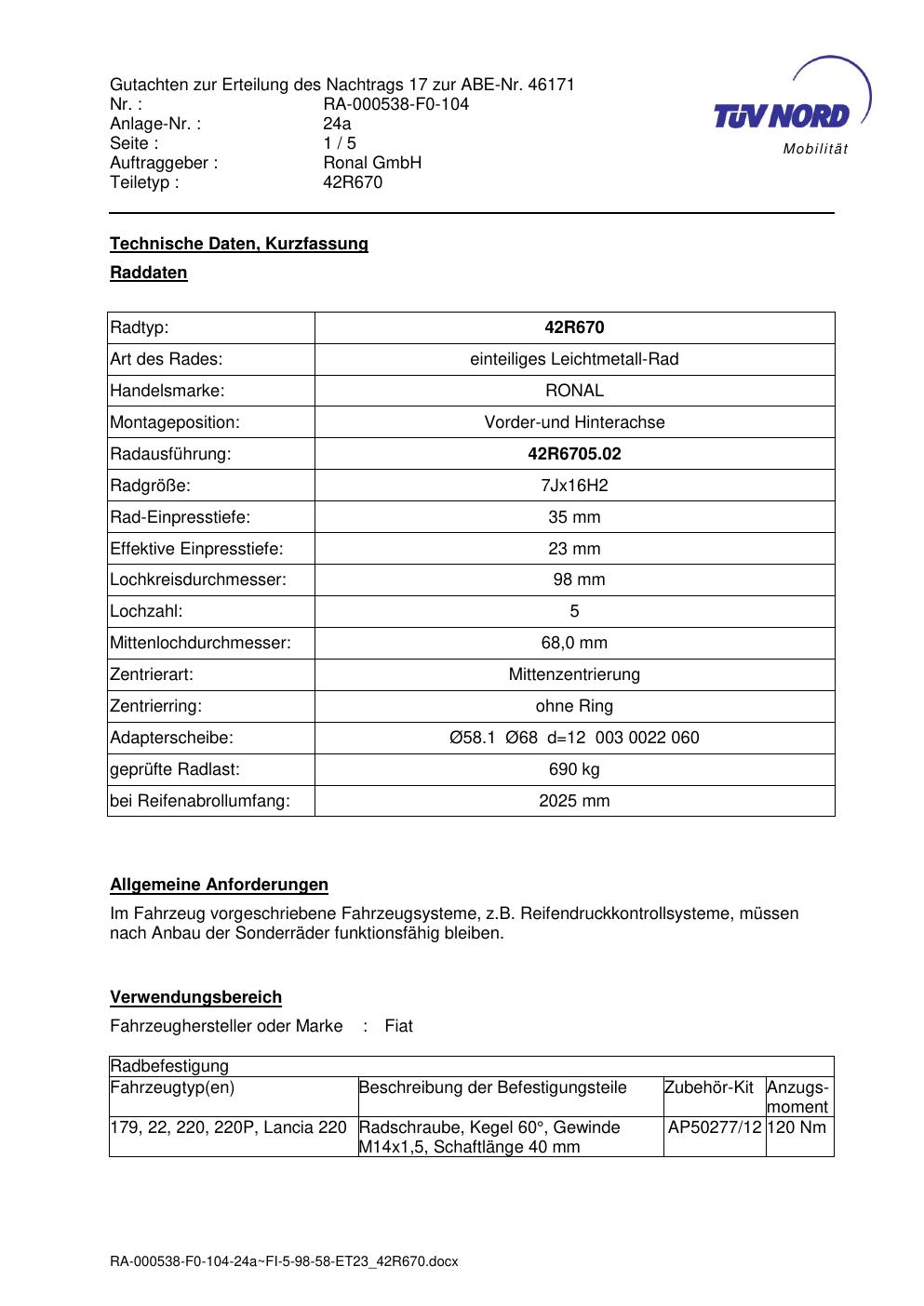 Dieses Gutachten (abe) bezieht sich auf die Alufelge Ronal 42R670 in der Ausführung 7Jx16 ET 0, Mittenloch 0 mm (KBA 46171). Im PDF findest du typischerweise zulässige Reifengrößen, Auflagen/Anbauhinweise und – je nach Dokument – Hinweise zur Eintragung.