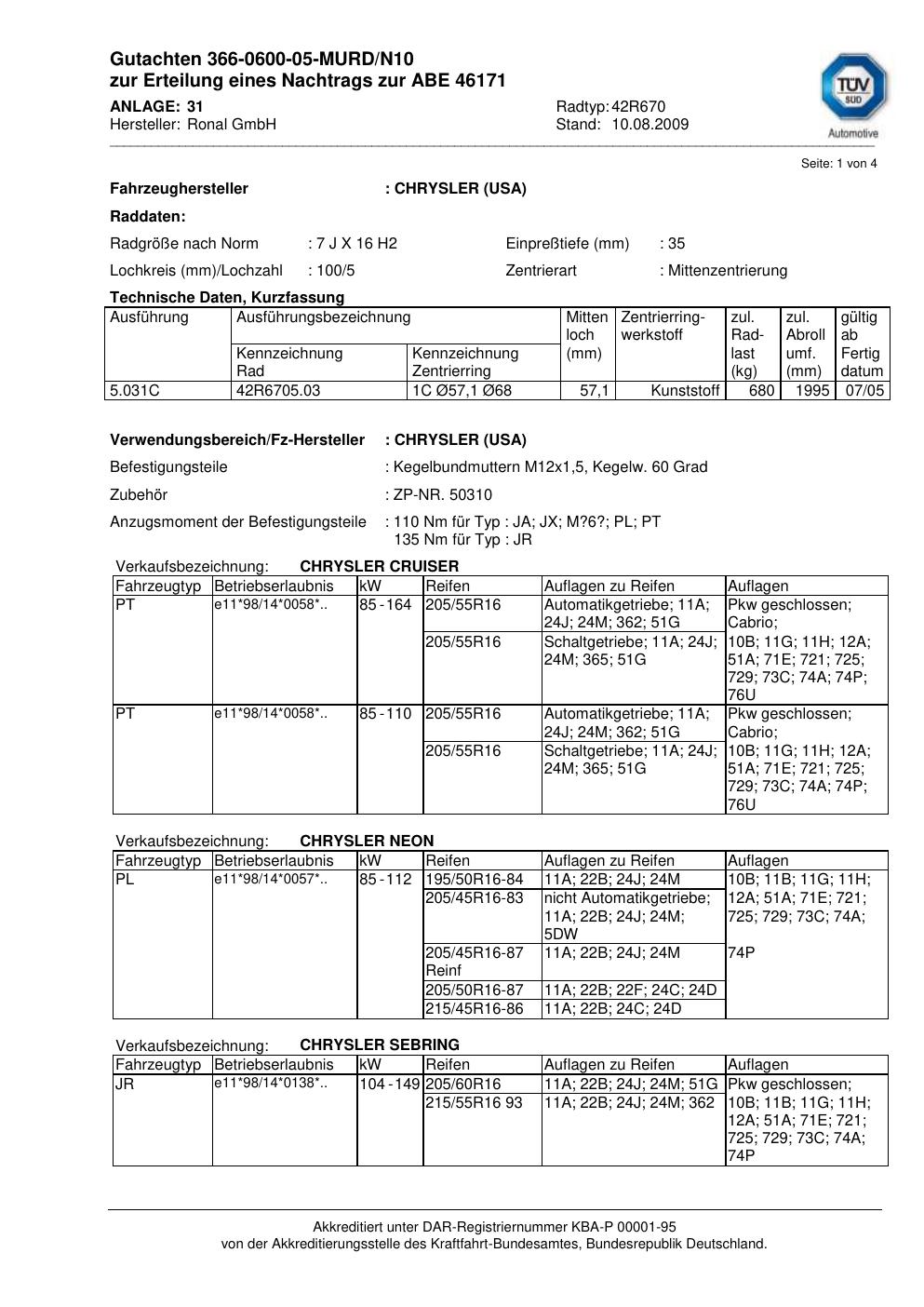 Dieses Gutachten (abe) bezieht sich auf die Alufelge Ronal 42R670 in der Ausführung 7Jx16 ET 0, Mittenloch 0 mm (KBA 46171). Im PDF findest du typischerweise zulässige Reifengrößen, Auflagen/Anbauhinweise und – je nach Dokument – Hinweise zur Eintragung.