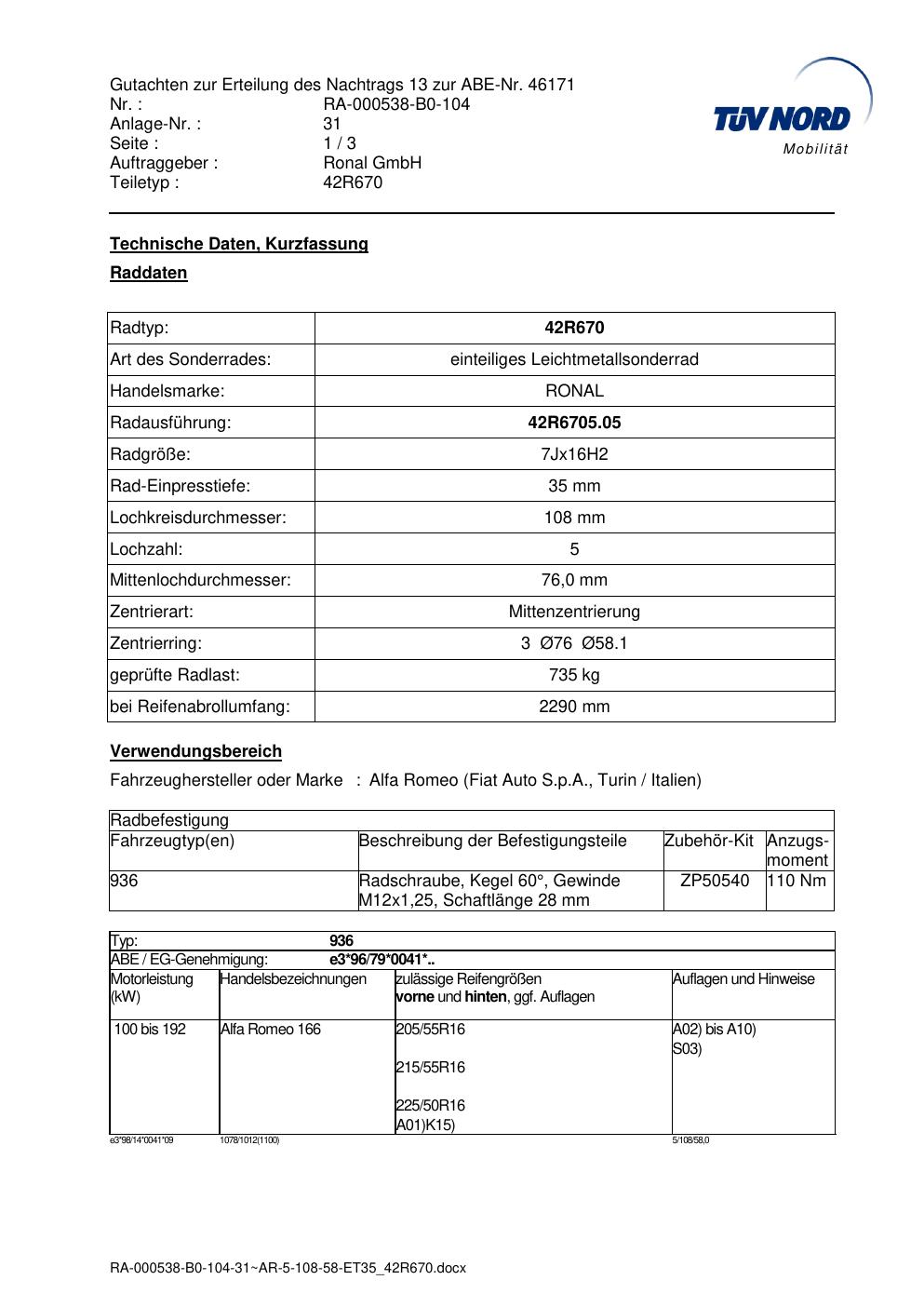 Dieses Gutachten (abe) bezieht sich auf die Alufelge Ronal 42R670 in der Ausführung 7Jx16 ET 0, Mittenloch 0 mm (KBA 46171). Im PDF findest du typischerweise zulässige Reifengrößen, Auflagen/Anbauhinweise und – je nach Dokument – Hinweise zur Eintragung.