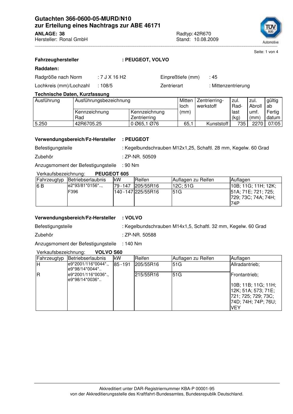Dieses Gutachten (abe) bezieht sich auf die Alufelge Ronal 42R670 in der Ausführung 7Jx16 ET 0, Mittenloch 0 mm (KBA 46171). Im PDF findest du typischerweise zulässige Reifengrößen, Auflagen/Anbauhinweise und – je nach Dokument – Hinweise zur Eintragung.
