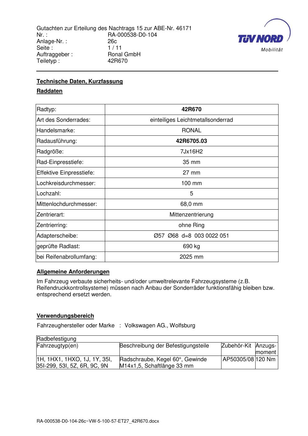 Dieses Gutachten (abe) bezieht sich auf die Alufelge Ronal 42R670 in der Ausführung 7Jx16 ET 0, Mittenloch 0 mm (KBA 46171). Im PDF findest du typischerweise zulässige Reifengrößen, Auflagen/Anbauhinweise und – je nach Dokument – Hinweise zur Eintragung.