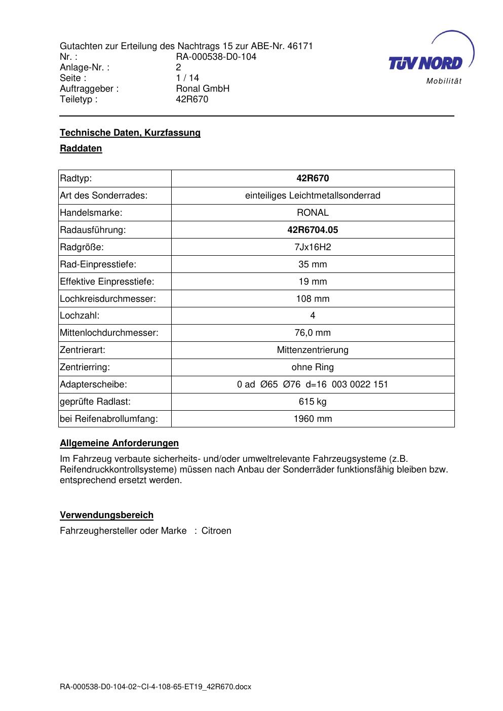 Dieses Gutachten (abe) bezieht sich auf die Alufelge Ronal 42R670 in der Ausführung 7Jx16 ET 0, Mittenloch 0 mm (KBA 46171). Im PDF findest du typischerweise zulässige Reifengrößen, Auflagen/Anbauhinweise und – je nach Dokument – Hinweise zur Eintragung.
