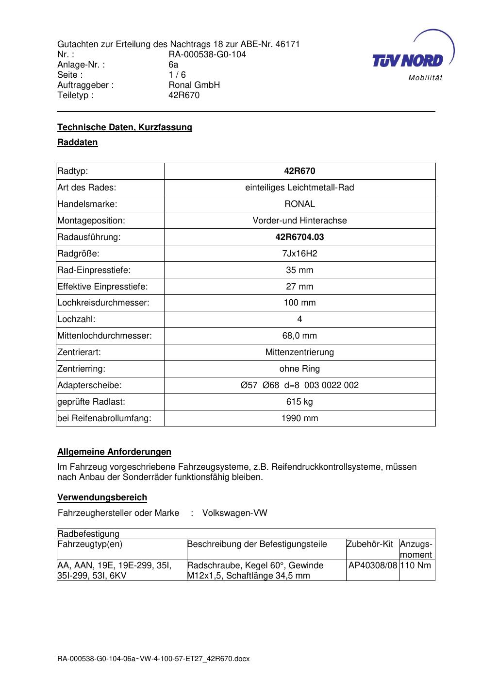 Dieses Gutachten (abe) bezieht sich auf die Alufelge Ronal 42R670 in der Ausführung 7Jx16 ET 0, Mittenloch 0 mm (KBA 46171). Im PDF findest du typischerweise zulässige Reifengrößen, Auflagen/Anbauhinweise und – je nach Dokument – Hinweise zur Eintragung.