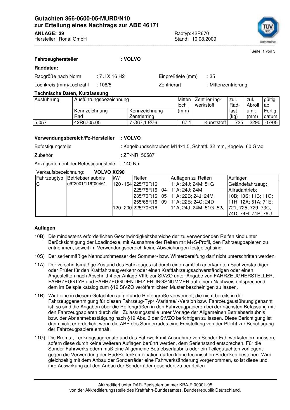Dieses Gutachten (abe) bezieht sich auf die Alufelge Ronal 42R670 in der Ausführung 7Jx16 ET 0, Mittenloch 0 mm (KBA 46171). Im PDF findest du typischerweise zulässige Reifengrößen, Auflagen/Anbauhinweise und – je nach Dokument – Hinweise zur Eintragung.