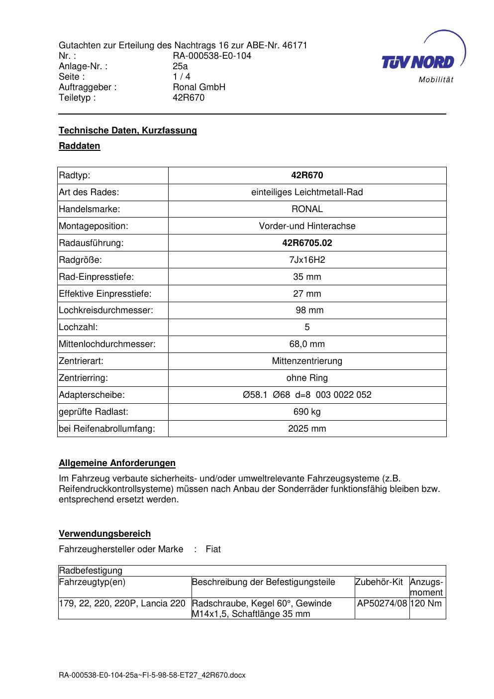 Dieses Gutachten (abe) bezieht sich auf die Alufelge Ronal 42R670 in der Ausführung 7Jx16 ET 0, Mittenloch 0 mm (KBA 46171). Im PDF findest du typischerweise zulässige Reifengrößen, Auflagen/Anbauhinweise und – je nach Dokument – Hinweise zur Eintragung.