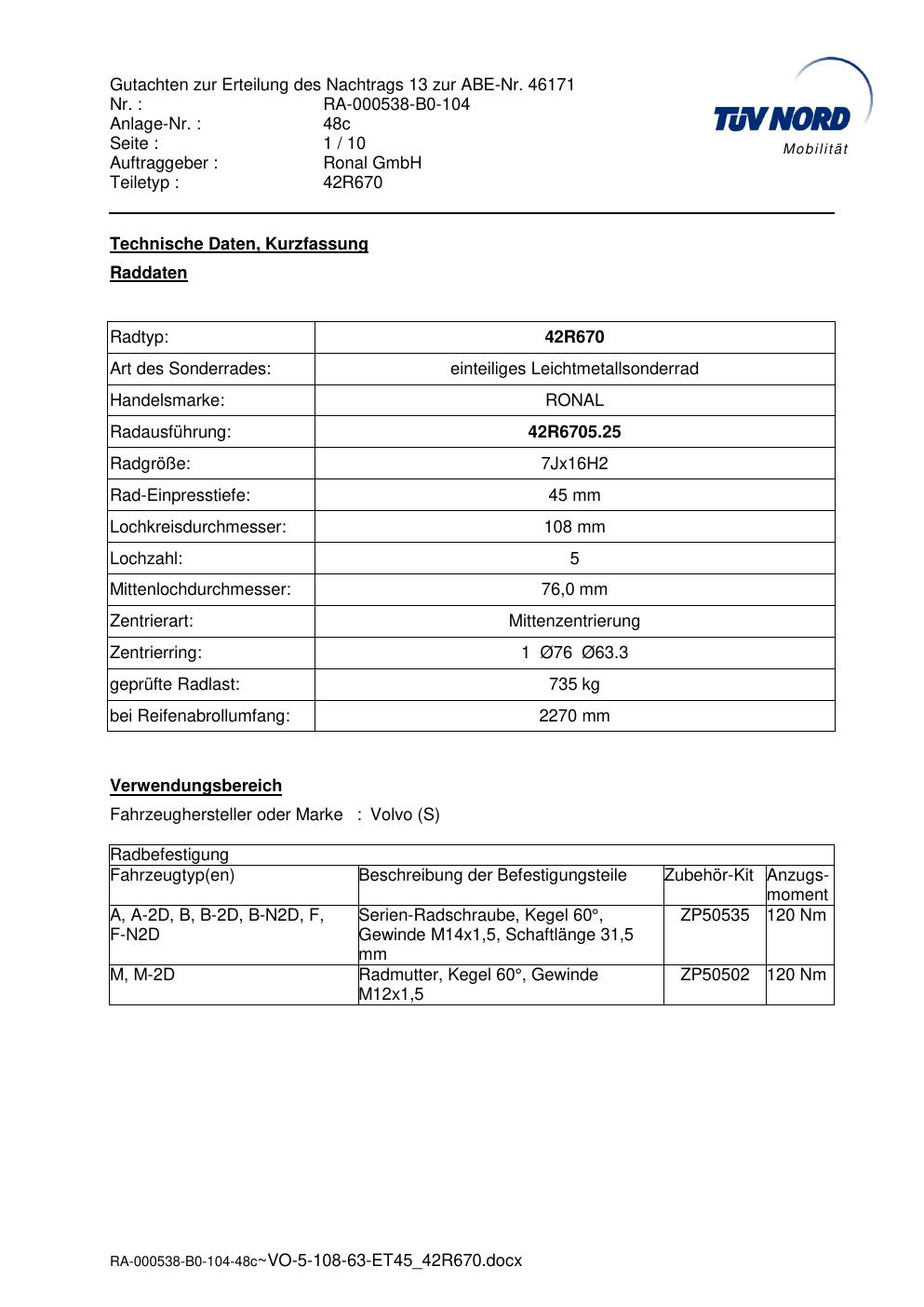 Dieses Gutachten (abe) bezieht sich auf die Alufelge Ronal 42R670 in der Ausführung 7Jx16 ET 0, Mittenloch 0 mm (KBA 46171). Im PDF findest du typischerweise zulässige Reifengrößen, Auflagen/Anbauhinweise und – je nach Dokument – Hinweise zur Eintragung.
