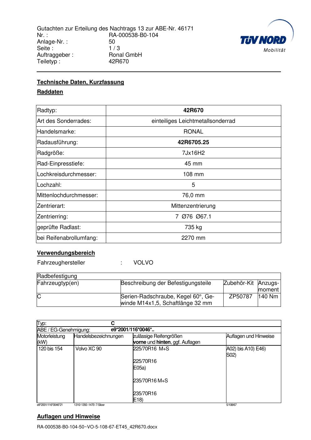 Dieses Gutachten (abe) bezieht sich auf die Alufelge Ronal 42R670 in der Ausführung 7Jx16 ET 0, Mittenloch 0 mm (KBA 46171). Im PDF findest du typischerweise zulässige Reifengrößen, Auflagen/Anbauhinweise und – je nach Dokument – Hinweise zur Eintragung.