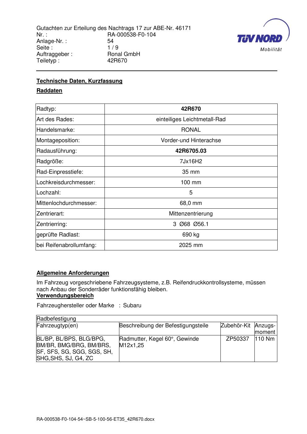Dieses Gutachten (abe) bezieht sich auf die Alufelge Ronal 42R670 in der Ausführung 7Jx16 ET 0, Mittenloch 0 mm (KBA 46171). Im PDF findest du typischerweise zulässige Reifengrößen, Auflagen/Anbauhinweise und – je nach Dokument – Hinweise zur Eintragung.