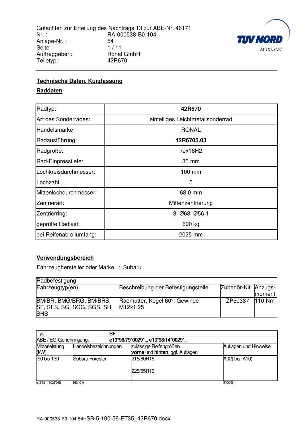 Dieses Gutachten (abe) bezieht sich auf die Alufelge Ronal 42R670 in der Ausführung 7Jx16 ET 0, Mittenloch 0 mm (KBA 46171). Im PDF findest du typischerweise zulässige Reifengrößen, Auflagen/Anbauhinweise und – je nach Dokument – Hinweise zur Eintragung.