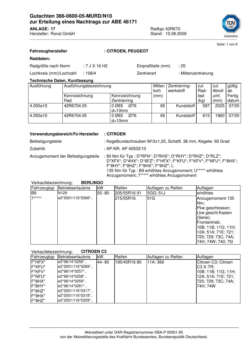 Dieses Gutachten (abe) bezieht sich auf die Alufelge Ronal 42R670 in der Ausführung 7Jx16 ET 0, Mittenloch 0 mm (KBA 46171). Im PDF findest du typischerweise zulässige Reifengrößen, Auflagen/Anbauhinweise und – je nach Dokument – Hinweise zur Eintragung.