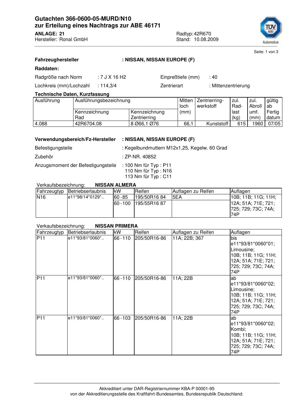 Dieses Gutachten (abe) bezieht sich auf die Alufelge Ronal 42R670 in der Ausführung 7Jx16 ET 0, Mittenloch 0 mm (KBA 46171). Im PDF findest du typischerweise zulässige Reifengrößen, Auflagen/Anbauhinweise und – je nach Dokument – Hinweise zur Eintragung.