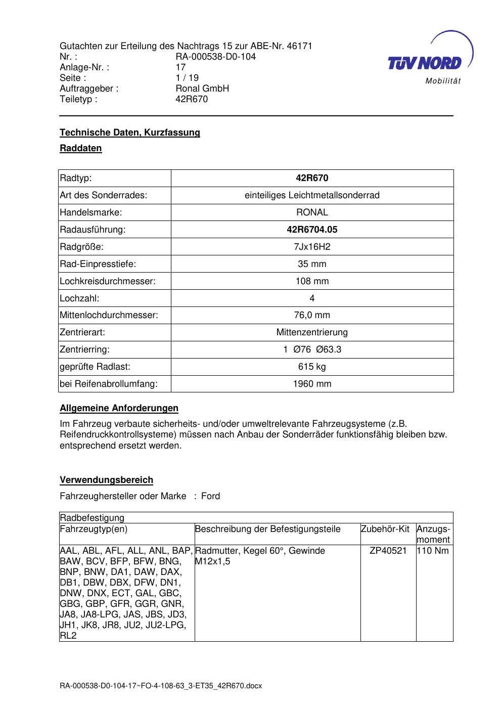 Dieses Gutachten (abe) bezieht sich auf die Alufelge Ronal 42R670 in der Ausführung 7Jx16 ET 0, Mittenloch 0 mm (KBA 46171). Im PDF findest du typischerweise zulässige Reifengrößen, Auflagen/Anbauhinweise und – je nach Dokument – Hinweise zur Eintragung.