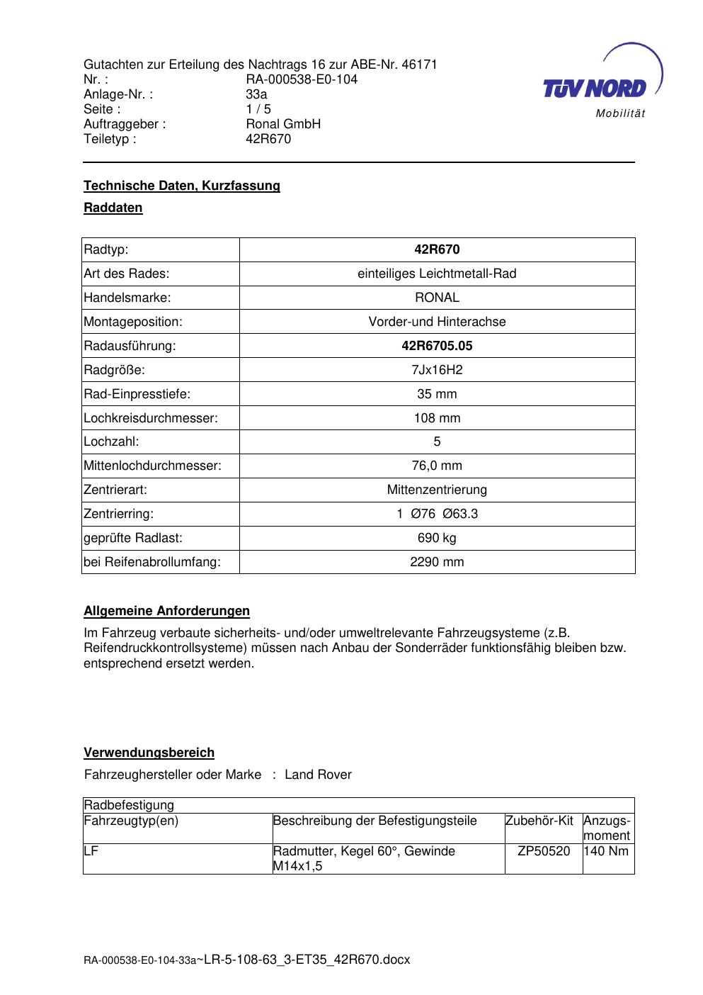 Dieses Gutachten (abe) bezieht sich auf die Alufelge Ronal 42R670 in der Ausführung 7Jx16 ET 0, Mittenloch 0 mm (KBA 46171). Im PDF findest du typischerweise zulässige Reifengrößen, Auflagen/Anbauhinweise und – je nach Dokument – Hinweise zur Eintragung.