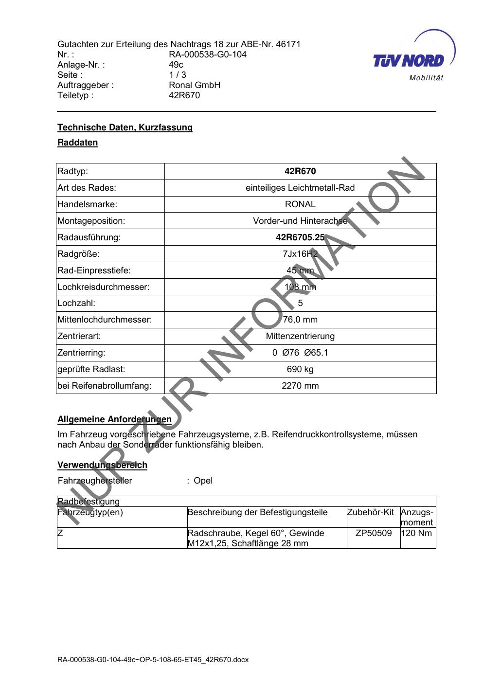 Dieses Gutachten (abe) bezieht sich auf die Alufelge Ronal 42R670 in der Ausführung 7Jx16 ET 0, Mittenloch 0 mm (KBA 46171). Im PDF findest du typischerweise zulässige Reifengrößen, Auflagen/Anbauhinweise und – je nach Dokument – Hinweise zur Eintragung.