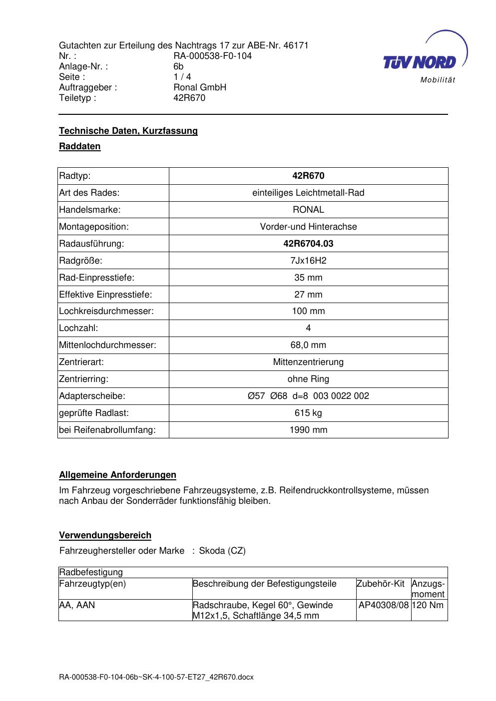 Dieses Gutachten (abe) bezieht sich auf die Alufelge Ronal 42R670 in der Ausführung 7Jx16 ET 0, Mittenloch 0 mm (KBA 46171). Im PDF findest du typischerweise zulässige Reifengrößen, Auflagen/Anbauhinweise und – je nach Dokument – Hinweise zur Eintragung.