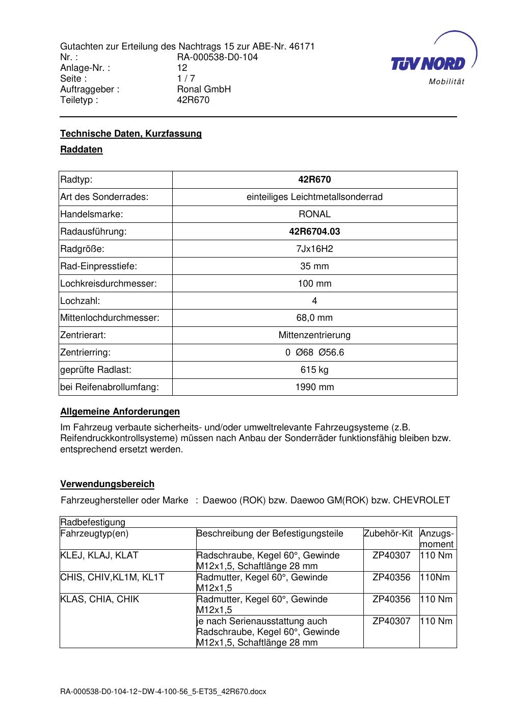 Dieses Gutachten (abe) bezieht sich auf die Alufelge Ronal 42R670 in der Ausführung 7Jx16 ET 0, Mittenloch 0 mm (KBA 46171). Im PDF findest du typischerweise zulässige Reifengrößen, Auflagen/Anbauhinweise und – je nach Dokument – Hinweise zur Eintragung.