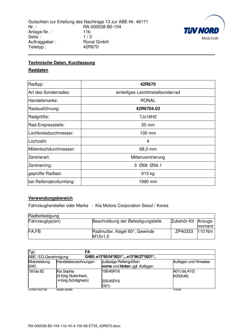 Dieses Gutachten (abe) bezieht sich auf die Alufelge Ronal 42R670 in der Ausführung 7Jx16 ET 0, Mittenloch 0 mm (KBA 46171). Im PDF findest du typischerweise zulässige Reifengrößen, Auflagen/Anbauhinweise und – je nach Dokument – Hinweise zur Eintragung.