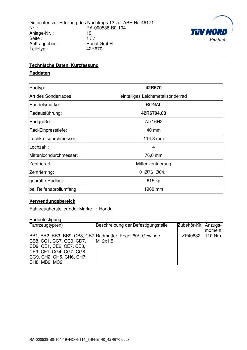 Dieses Gutachten (abe) bezieht sich auf die Alufelge Ronal 42R670 in der Ausführung 7Jx16 ET 0, Mittenloch 0 mm (KBA 46171). Im PDF findest du typischerweise zulässige Reifengrößen, Auflagen/Anbauhinweise und – je nach Dokument – Hinweise zur Eintragung.
