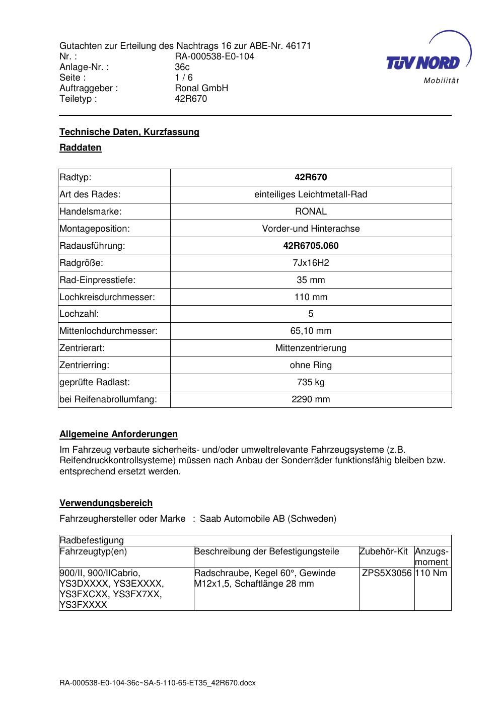 Dieses Gutachten (abe) bezieht sich auf die Alufelge Ronal 42R670 in der Ausführung 7Jx16 ET 0, Mittenloch 0 mm (KBA 46171). Im PDF findest du typischerweise zulässige Reifengrößen, Auflagen/Anbauhinweise und – je nach Dokument – Hinweise zur Eintragung.