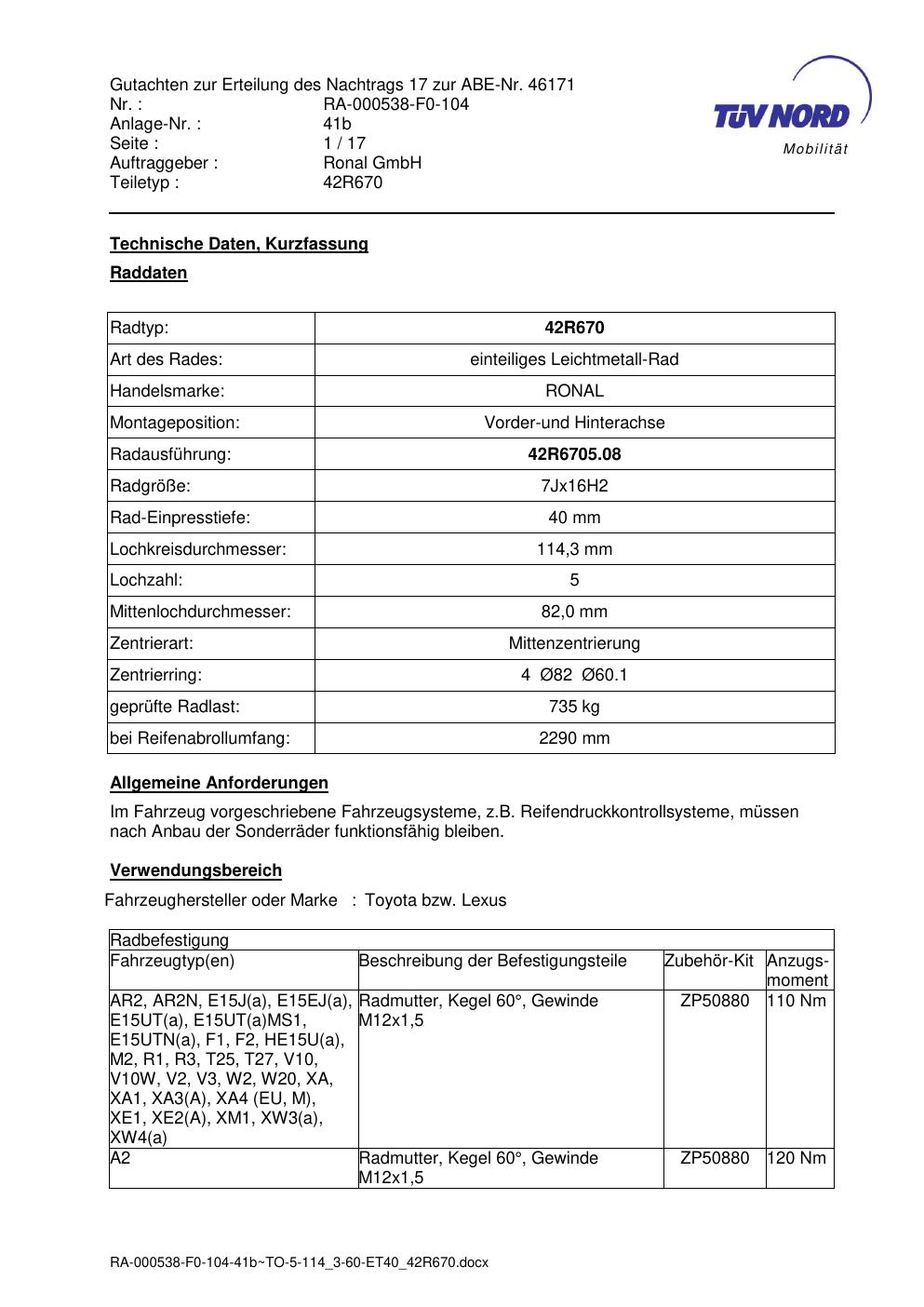 Dieses Gutachten (abe) bezieht sich auf die Alufelge Ronal 42R670 in der Ausführung 7Jx16 ET 0, Mittenloch 0 mm (KBA 46171). Im PDF findest du typischerweise zulässige Reifengrößen, Auflagen/Anbauhinweise und – je nach Dokument – Hinweise zur Eintragung.